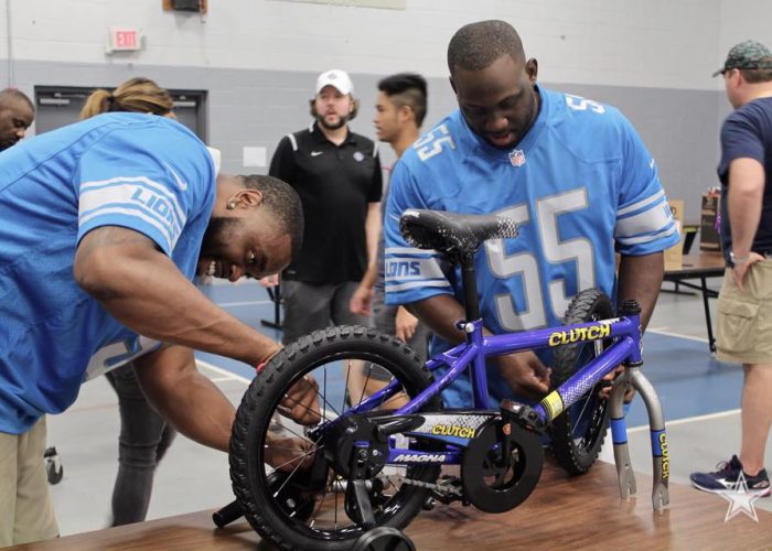 Event info: We teamed up with players from the NFL’s Dallas Cowboys and Detroit Lions to do a big bike build. Players and employees built and gifted 40 bikes to undeserved youth from Mission Arlington. Rewarding families and children for demonstrating commitment to their education and building critical life skills.